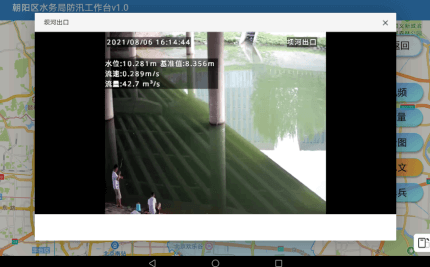 朝阳区防汛工作台1.0"iPad端实时感知水文模块,国内首例嵌入式AI视频摄像机水文AI识别测水位、流量、流速,搭载私有hls流服务器和Javaweb技术播放视频。供局领导查看河道水文信息并可观看现场视频。