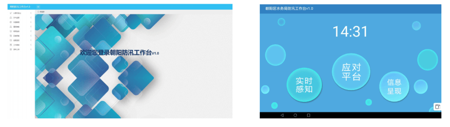 朝阳区防汛工作台”采用“大屏数据可视化、PC端、平板端”为基础的“一网三平台”的工作模式